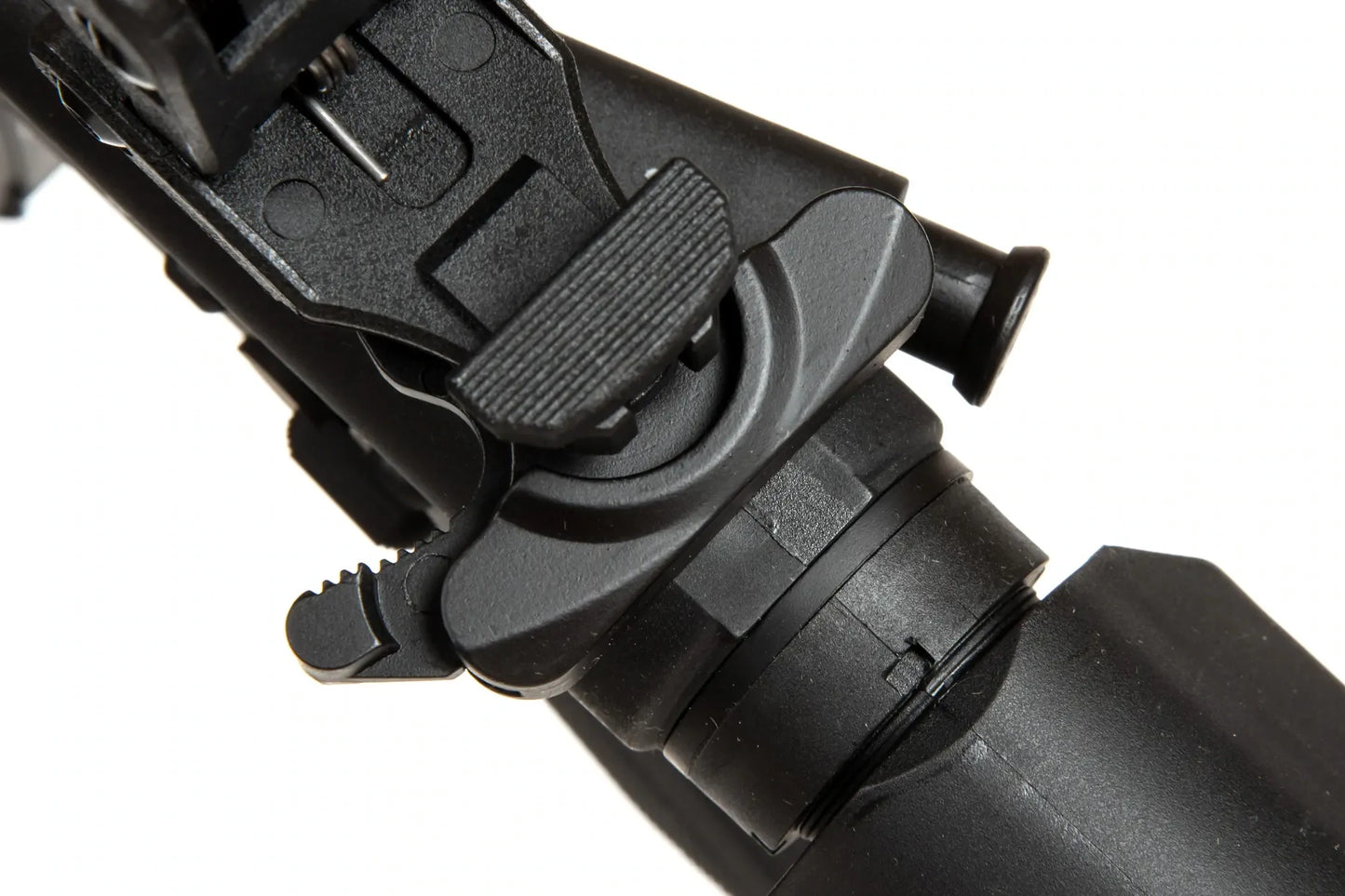 The barrel has been very well fitted the user will not experience any play between the lower and upper parts of the barrel. The use of a body and front made of lightweight plastic allowed for a reduction in weight, making it ideal as a replica for dynamic CQB games. Furthermore, the nylon fibre reinforcement makes the construction more durable than other polymer constructions.